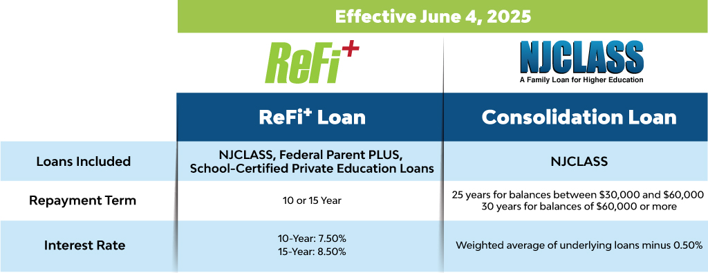 The NJCLASS ReFi+ Loan assists borrowers who want to lower the total amount spent on repaying their student loans by combining multiple loans into one single payment with a lower interest rate. The NJCLASS Consolidation Loan is designed to assist borrowers who need lower monthly payments by combining multiple NJCLASS Loans into one single payment over a longer repayment term.
